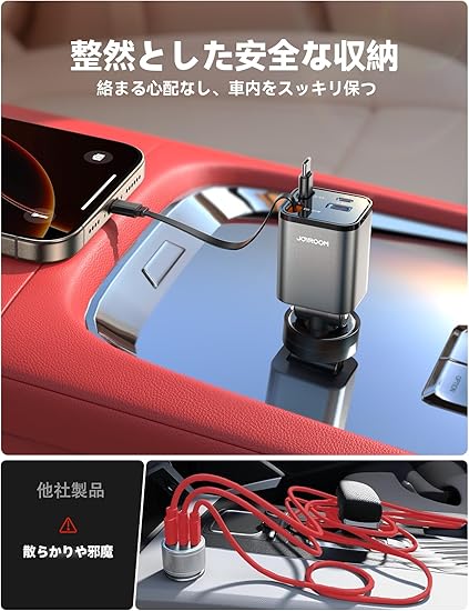 【巻き取り式・2本USB-C】JOYROOM 車載充電器 巻き取り式充電ケーブル 車 シガーソケット 69W【4台同時充電・超コンパクト設計】 カーチャージャー 急速充電 12V/24V対応 iPhone/Android対応 a