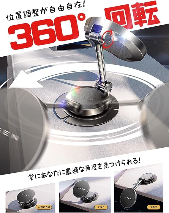 【360°回転 & 折りたたみ式】LISEN スマホホルダー 車 マグセーフ充電器 車 magsafe充電器 車載 ワイヤレス充電 ダッシュボード 車載ホルダー【24 N55 マグネット】シンプルなデザイン 強力磁力 アーム 耐久性 取り付け簡単 iPhone16 15 14 13 12 Pro MAX シリーズ機種対応 a