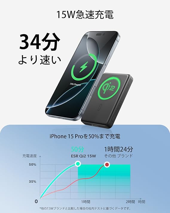 【Qi2認証の急速充電】:Qi2認証の15W MagSafe モバイルバッテリーは、7.5W充電器より2倍速く、より安全で、より速く、より信頼性の高い充電を可能にします。
