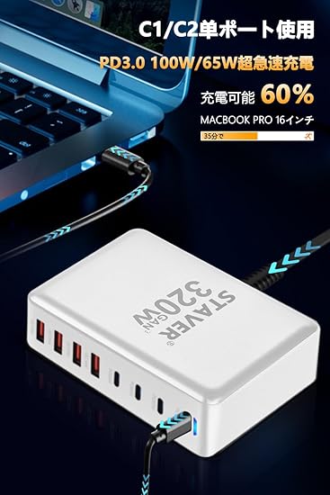 320W 充電器 【 GaNFastⅢ 8ポート 単口max 100W 1.5m電源ケーブル】 PD3.0対応【PSE技術基準適合】100W常時対応 8ポート1*100W&2*65W&4*QC18W 4 USB-C&4 USB-A 縦式省スペース ダブル 複数ノートPCに急速充電対応 MacBook Pro PD対応 iPad/iPhone/Android/その他 (ホワイト-320W) a
