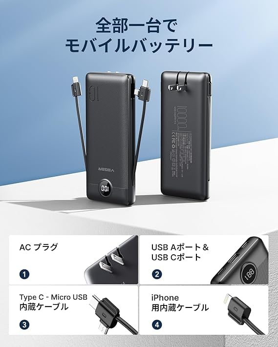 【バッテリー 大容量·幅広い互換性】モバイル バッテリー10000mah急速で、あなたのデバイスをフルパワーにします。 VEGERモバイルバッテリー コンセント一体型は、すべてのiPhone、iPad、サムスン、Google Pixel、タブレットと広く互換性があります。iPhone、iPadのための最高のポータブルバッテリー充電器、サムスン、Google Pixelと他の携帯電話のタブレットのための素晴らしいUSB Cポータブル充電器も、ちょうどあなたのデバイスに接続し、外部バッテリーは高速充