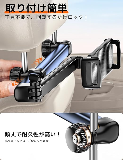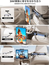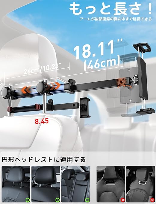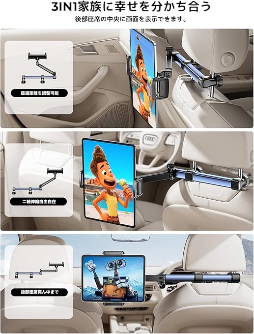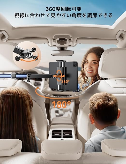 【業界最長二軸伸縮アーム・後部座席真ん中まで ・幸せを分かち合う】2025最新改良版タブレットホルダー新登場!弊社は市販商品を改良し、アームが業界最長(二軸合わせて41.5cm)の車載タブレットホルダーを開発しました。二軸伸縮アームのデザインで、距離制限なし、自由に目からの最適な距離を調整できます。長時間のドライブでも子供も騒がないで遊ん出来ています。目に優しい設計で子供の視力にも保護できます。なお、より長いアームなので、後部座席の真ん中に延長でき、複数人座っている場合でも一緒に画面を楽しめます
