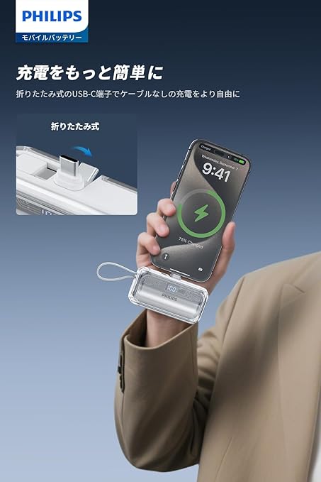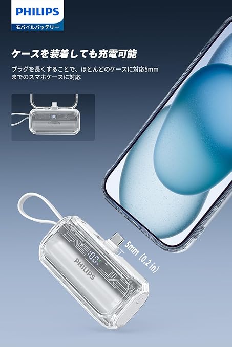 Philips (フィリップス) モバイルバッテリー 5000mAh 小型 USB-Cコネクター USB-Cケーブル内蔵 直差し コードレス 軽量 大容量 二台同時充電 モバイル充電器 パススルー機能 PSE認証済 タイプc デバイス対応 DLP2568CW a