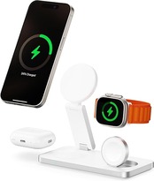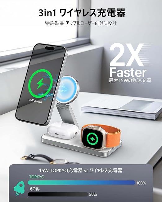MagSafe 3in1 ワイヤレス充電器、iPhone Apple Watch Airpods 同時充電、Apple対応、Qi認証(MFM)、マグセーフ スタンド 磁力150mT Max(ケース装着時最適化で2.5mm越えても位置固定)、総出力20W(iPhone 15W/Airpods 5W/Apple Watch 3W)Max、半導体冷却板内蔵、寝室 オフィス向け TOPKYO ホワイト a