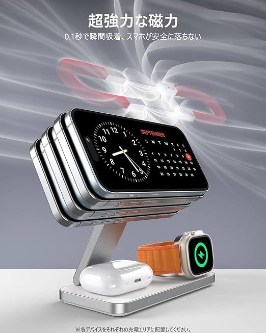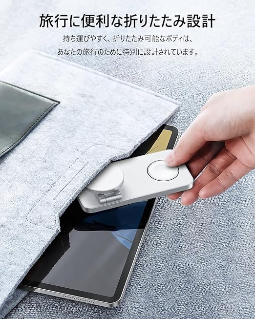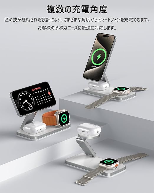 意匠登録製品:TOPKYO 3 in 1 ワイヤレス充電器は、設計段階から厳密なモデリング計算を重ね、このMagSafe対応ワイヤレス充電器としての安定性と携帯性を完璧に融合。コンパクトサイズでスペース効率化を実現し、本体底部の四隅には滑り止めパッドを配備。動画視聴時でもオフィスでの使用時でも、その優れたパフォーマンスを存分に発揮します。