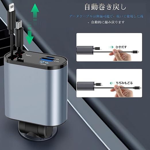 【2025新設計】 車用充電器 車 シガーソケット 4in1 車 充電器 4台同時充電 カーチャージャー 巻き取り式充電ケーブル 2本 Type-C100W/Lightning 20W急速充電 対応i-phone16/i-Phone 15/14/13/12, Galaxy S22/S21 Ultra, i-Padなど LED付オー電圧測定 DC12/24V車対応 a