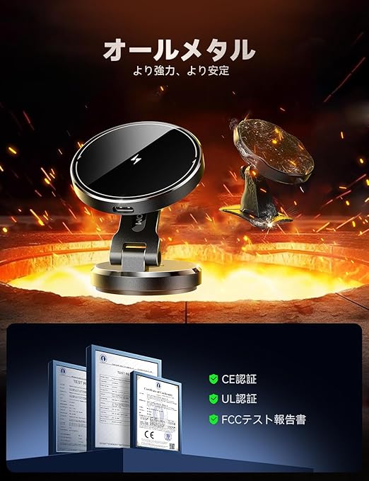【高速ワイヤレス充電&プロ級の耐久性】JOYROOMのmagsafe充電器 車載は、MagSafe対応でiPhone 16/15/14/13/12シリーズに最大15Wの高速充電を実現します!スマホを置くだけで、磁気吸着により自動的に位置を合わせ、素早く安定した充電がスタートします。純正チップ搭載で変換効率が向上し、従来のマグセーフ充電器 車と比べて最大2倍の速さで充電可能です。「ナビを見ながらでも電池が増える」驚きの効率が体験できます。高品質な全金属素材を採用し、優れた耐久性と美しい質感を実現し