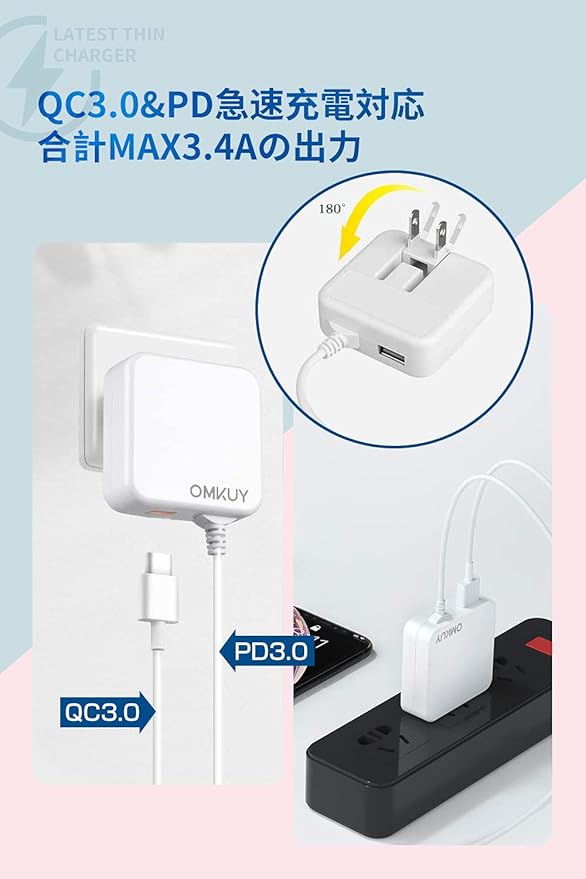 【PD&QC3.0/合計3.4A】USB充電器は合計3.4Aの高出力で最大2台の機器が同時に充電可能です。Power Delivery(PD)対応するType-Cケーブルが最大20W出力、QC3.0対応USBポートは最大18Wの出力のiPhone・iPad・スマートフォン・タブレットの充電時間を大幅に短縮できます。 ※iPhoneを充電する場合、USBポートを使ってください。