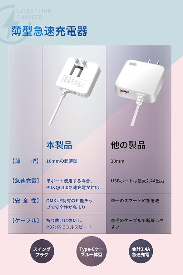 USB充電器 Type-C 急速充電 スマホ 充電器【NEWモデル/PD20w&QC3.0/1.6cm超薄型/1USBポート&1.5mType-Cケーブル/折り畳み式プラグ/合計3.4A】ケーブル一体型 ACアダプター コンセント 軽量 アンドロイド PSE認証済 iPhone15/Androidなど対応 a