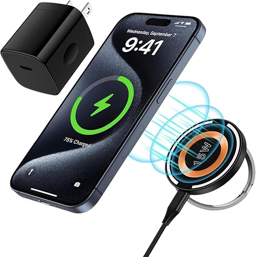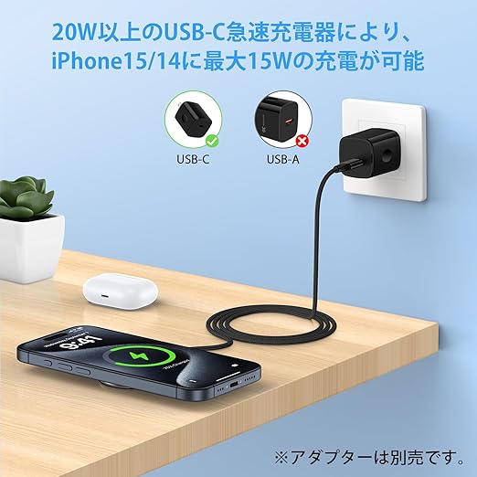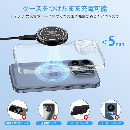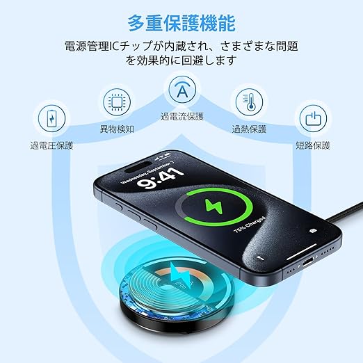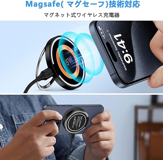 【最大15W・急速充電可能】ワイヤレス充電器はMag-safe技術を利用して、Mag-Safeに対応したiPhoneを15Wという能力でワイヤレス充電することが可能で、従来までのQI充電より2倍の充電速度になります。約3時間でiphone16 Pro Maxをフル充電可能です。(注:アップル純正品/20W以上のACアダプタが必要)。また、取り外す可能なTYPE-C充電ケーブルを付属しており、Mag-safe充電器と充電ケーブルは別々に収められるため,持ち運びしやすいの一方で、省スペースで収納でき