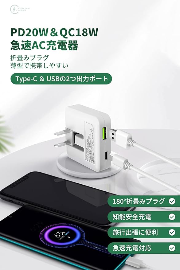 【新型USB-CとUSB -A両対応】USB充電器 Type-C PD20w&&QC3.0急速充電(1.6cm超薄型/2ポート/折畳式プラグ) スマホ ACアダプター コンパクト コンセント PSE認証済 iPhone15対応/iPad/Android&iOSなど対応 a