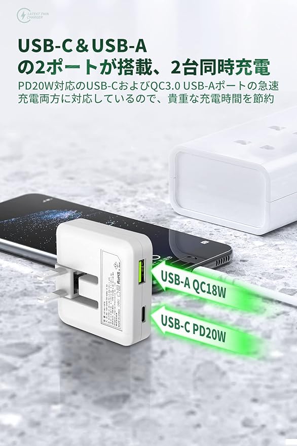 【USB-CとUSB-A両ポート超薄型】16MMで超薄型タイプのUSB充電器、縦並びのコンセントで上下を邪魔せずお気軽に使えます。薄型の割にPD20w対応のUSB-CポートとQC3.0対応のUSB-Aポートを各1つ搭載します。従来のUSB Aで充電できるスマホはもちろん対応できますが、最先端充電規格PDにも対応し、お手元デバイスの充電を全方位サポート致します。※ケーブルが付属しませんので、ご了承ください。