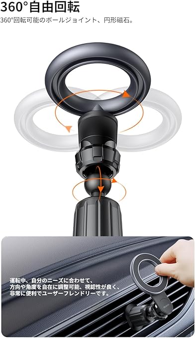【360度回転可能】 ボールジョイント、丸型ホルダーを搭載、360度回転可能、運転中でも自分のニーズに合わせて、縦横自由の方向や角度を自在に調整可能。