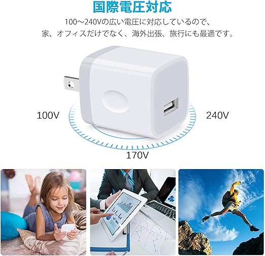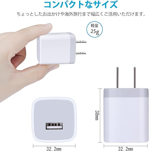 【USB充電器仕様】家庭用コンセントからスマホなどを充電できるUSB電源アダプタです。入力:AC100-240V、出力:DC5V/1.0A。サイズ(約):37mm*32mm*32mm 、重量:1個当たり25g。世界各国の電圧に対応しているので、お宅、オフィスだけでなく、海外出張、旅行にも最適です。