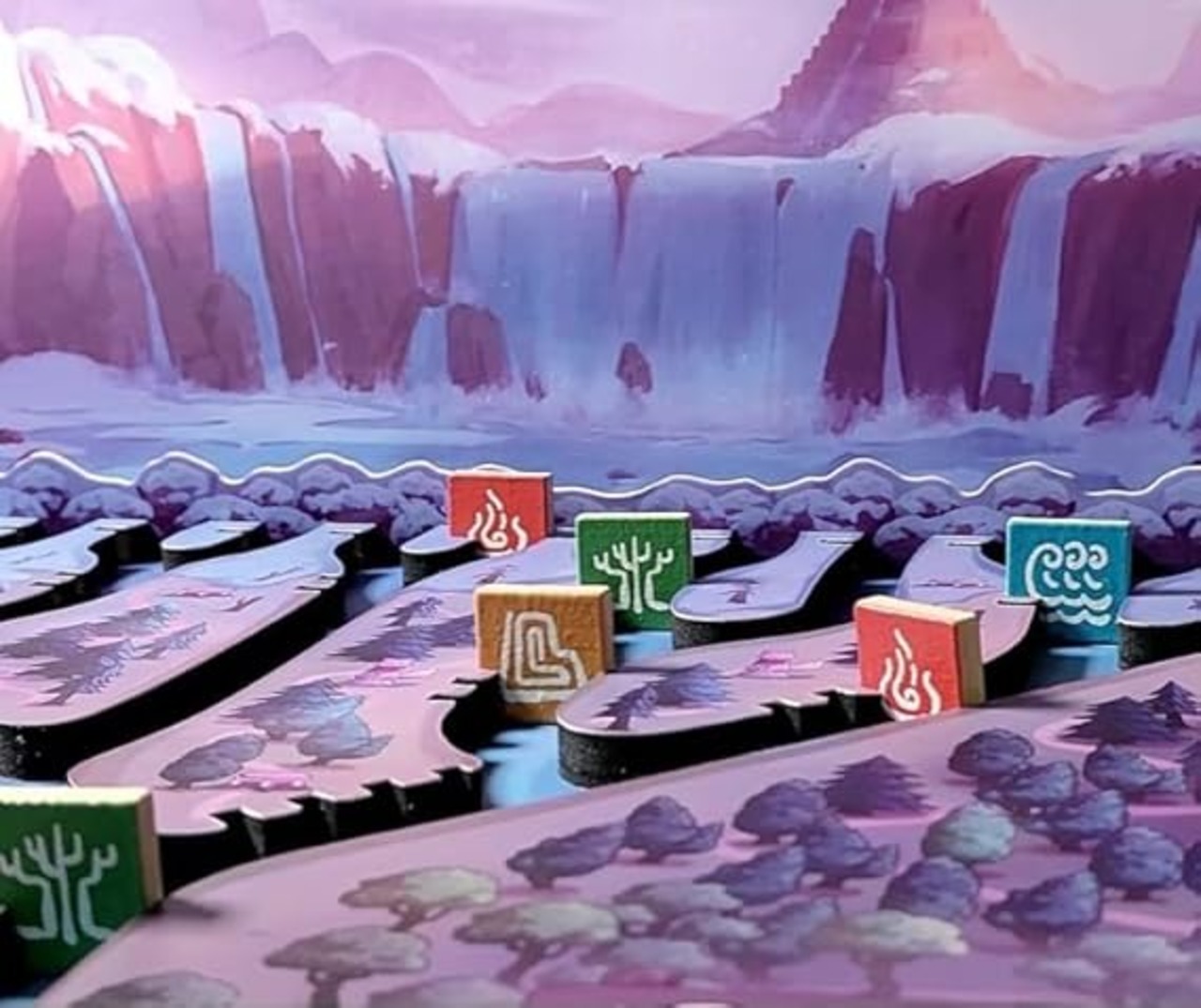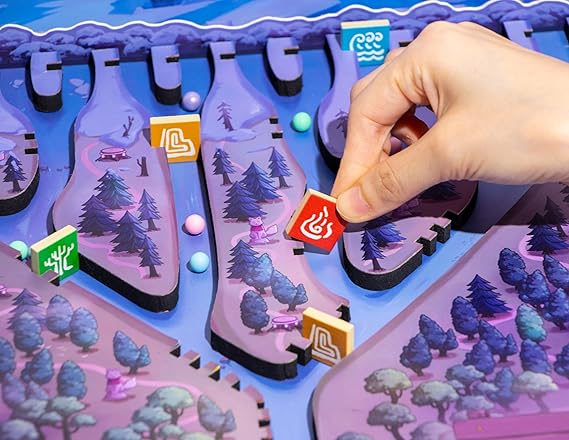川を流れる資源をコマでせき止めて競い合う、斬新なメカニクスのボードゲームです。