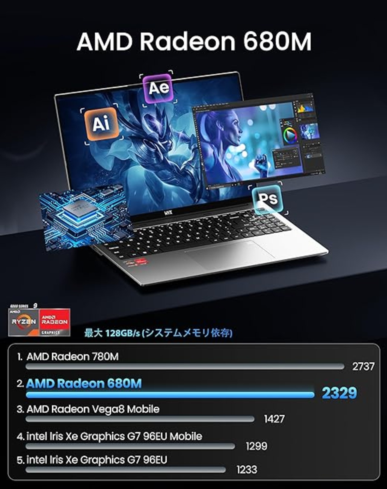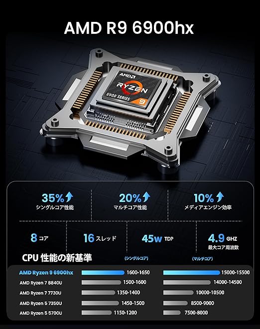 高性能コアパワーを発揮:8コア16スレッド、Zen 3+ アーキテクチャを採用。AMD Ryzen 9 6900HX モバイルプロセッサーは、最大 4.9GHz のブーストクロックを実現し、デスクトップ並みの高い性能を提供します。負荷の大きいクリエイティブ作業でのレンダリング、AAAタイトルゲーム、マルチタスクの同時実行など、幅広い場面で効率的に対応します。さらに先進的な 6nmプロセス技術 により、高い性能を発揮しつつ、優れた電力効率も実現。長時間にわたって安定した高性能を維持し、様々な作業を