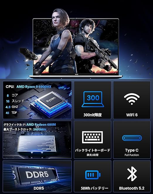 WVX 16インチFHDノートパソコンAMD Ryzen 9 6900HX (8C16T、最大4.9GHz),メモリ16GBDDR5 SSD 512GB Radeon 680M高速ゲーミングノートpc office搭?Windows11,重量1.8kgパソコン指紋認証 Bluetooth WiFi6 a