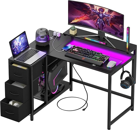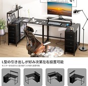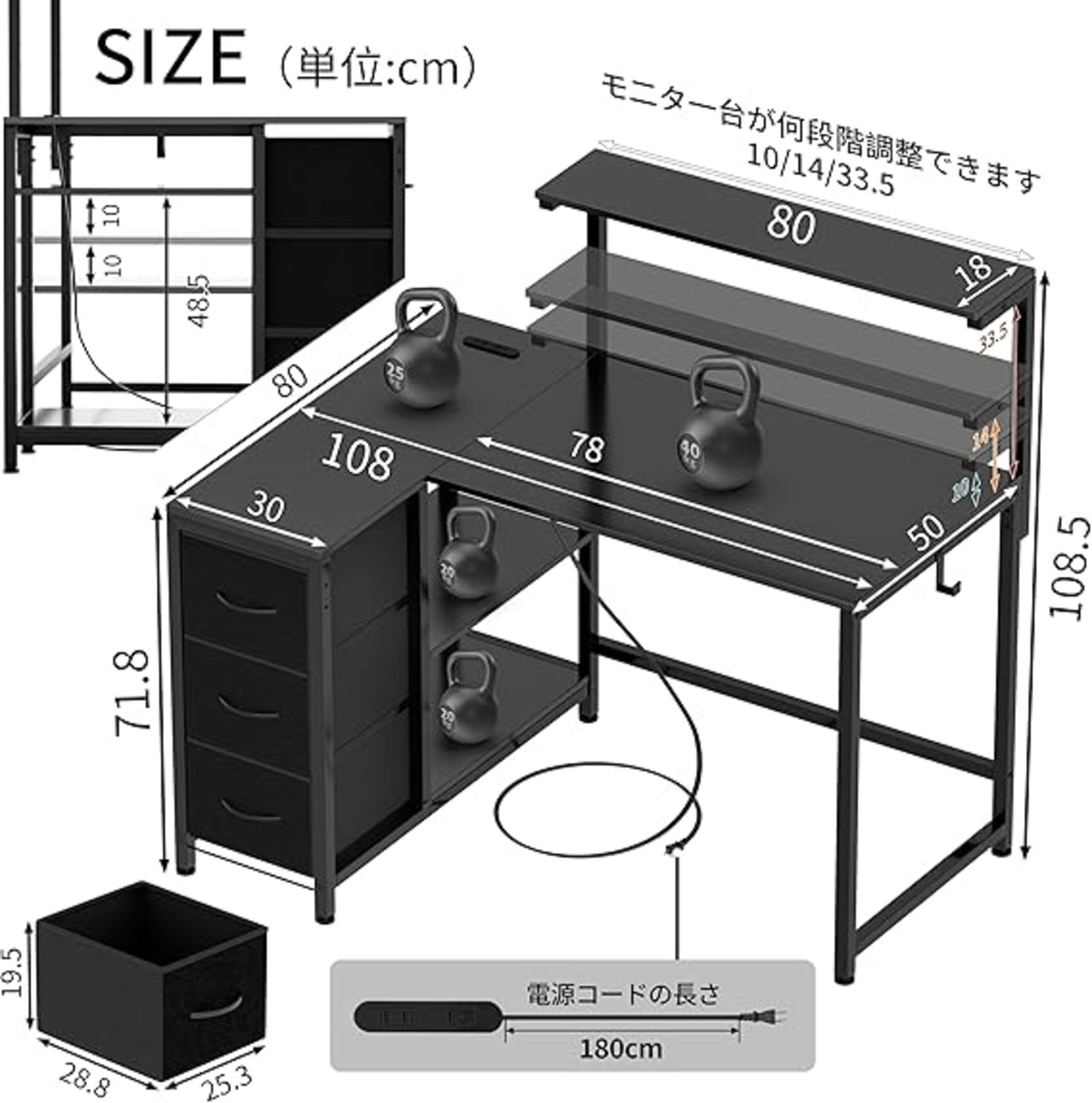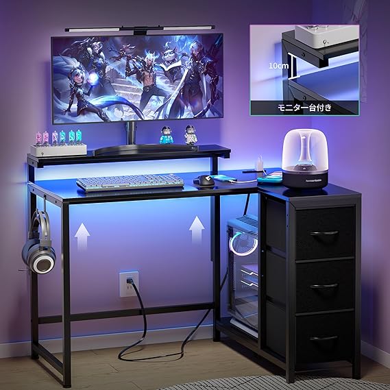 LunarLight PCパソコンデスク 幅108奥行80高さ85-108.5cm テレワーク L型デスク・左右組み換え自由 モニタ台の高さ調節可能 引き出しとコンセント付き 収納たっぷり ゲーミングデスク オフィスデスク 書斎 収納ラック付き (ブラックBK, L型) a