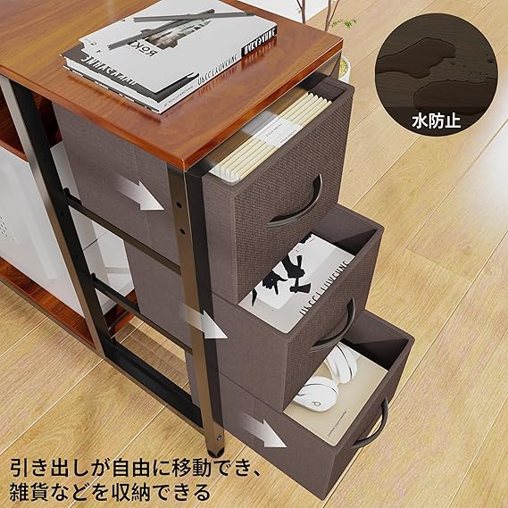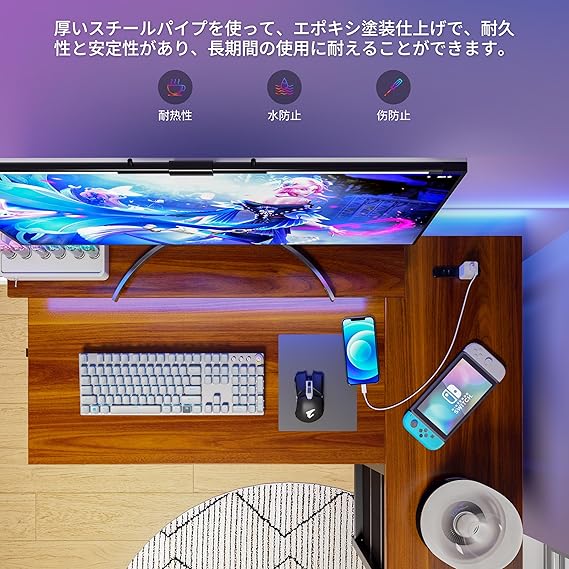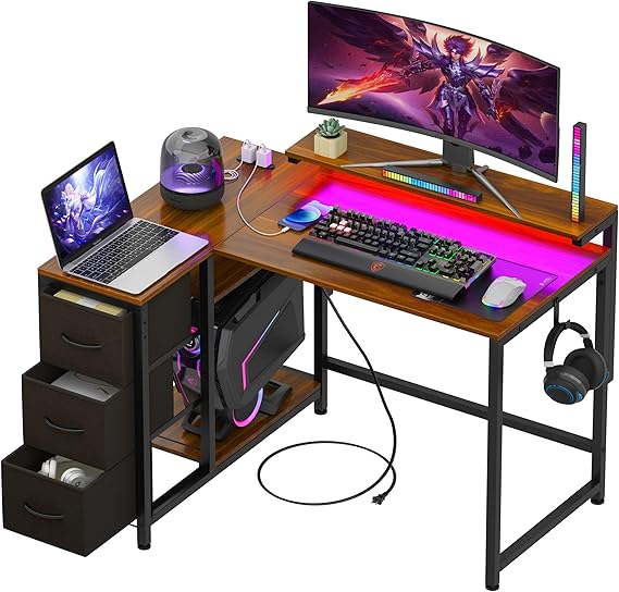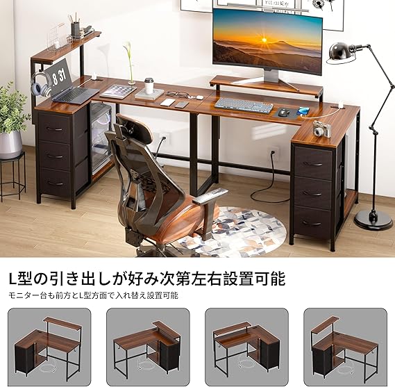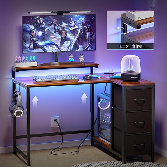 LunarLight PCパソコンデスク 幅108奥行80高さ85-108.5cm テレワーク L型デスク・左右組み換え自由 モニタ台の高さ調節可能 引き出しとコンセント付き 収納たっぷり ゲーミングデスク オフィスデスク 書斎 収納ラック付き (ダークブラウンDBR, L型) a