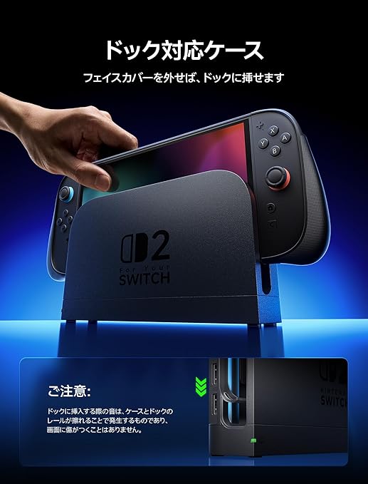 Switch 2 用 分離式プロテクターケース: Switch 2 専用設計のツーピース構造。ケースを外さずに JoyCon を簡単に着脱可能。ゲームモードを瞬時に切り替え、シームレスなプレイ体験を実現。注意:Switch 2にミドルフレームを取り付けた後、下部の両端を押してしっかりとフィットさせてください。ケースを装着したままドックに差し込む際に少しきつく感じる場合は、軽く押し込んでください。その際に発生する摩擦音は正常であり、Switch 2に損傷を与えることはありません。