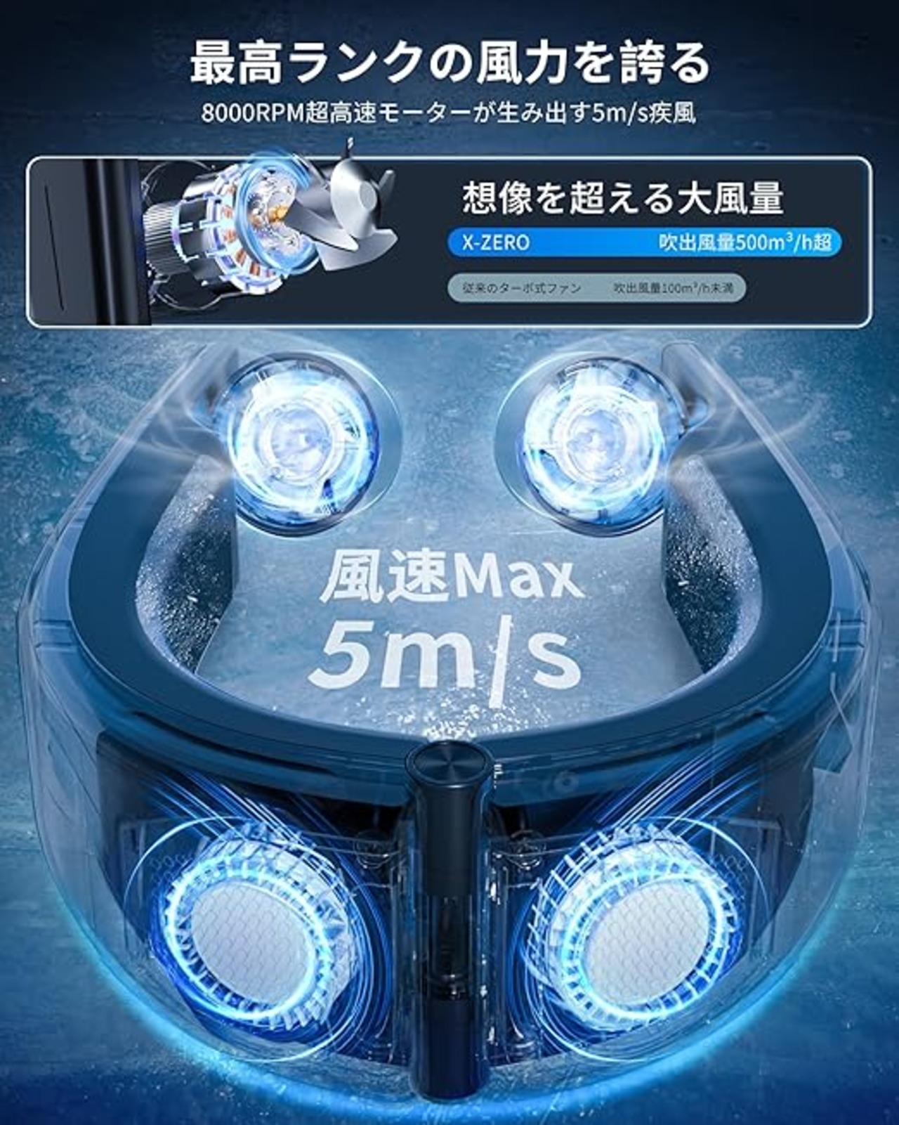 【5m/s強力送風・180°角度調整可能】優れた冷却機能に加え、8000RPM高速モーターでかつてない500m³/h超の風量を送り出します。左右二つの強力ファンはそれぞれ180°角度調整でき、頬・首