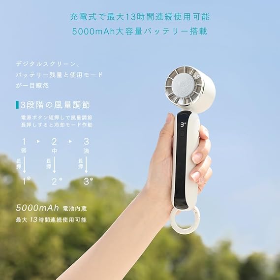 ハンディファン 冷却プレート 瞬間冷却 携帯扇風機 5000mAh大容量 最大13時間動作 手持ち扇風機 ポータブルファン 3段階風量調節 強力 扇風機 ハンディ Type-C 充電式 液晶画面 軽量 静音 ミニ 小型 クーラー機能 冷感 熱中症対策 暑さ対策 手持ち/首掛け/卓上 カラビナ付き a