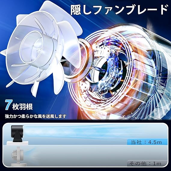 【低ノイズの小型隠しファンブレード】このサーキュレータは、7枚の斜め流ファンブレードでできており
