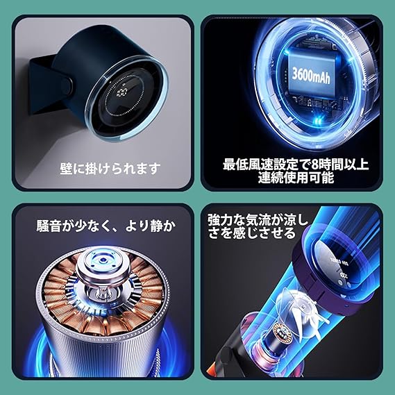 【風速と角度調節可能】当社の壁掛け扇風機は他のブランドとは異なります。ボタン式のデザインで、お好みに応じて1~100段階の風速を簡単に調節でき、涼しく快適な環境を作り出します。手動で115°の範囲で角度を変え、どこにいても冷却ファンの風を送ることができます。この小型ポータブルコードレス扇風機は、壁に掛けたり、机やテーブルなどの平らな場所に固定することができます。(長押しで速度を1-100に調整でき)