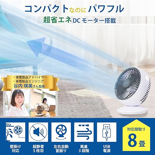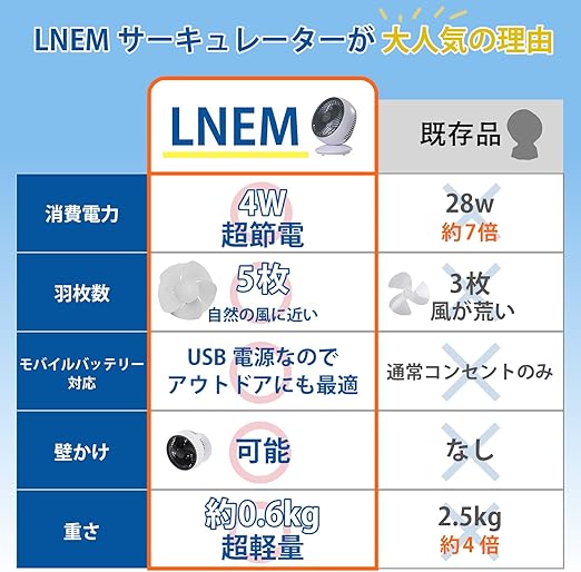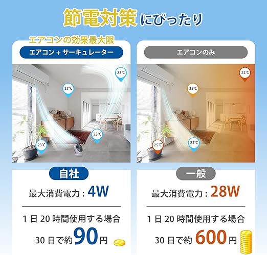 【究極の省エネモデル】LNEMサーキュレーターの最大消費電力は4W,静モードはなんと2Wとなり、人気サーキュレーターメーカーのなんと1/10。他社の28Wのサーキュレーターを1日20時間付けると、毎月660円ぐらいの電気代が発生しますが、弊社のサーキュレーターなら約100円しか発生しません。 一人暮らしやエアコンを効率的に使いたい人に最適(ご注意:実際の電気代は、外の気温、エアコンの出力使用スペースの広さ、電力会社の料金などの要因によって異なる場合があります。)