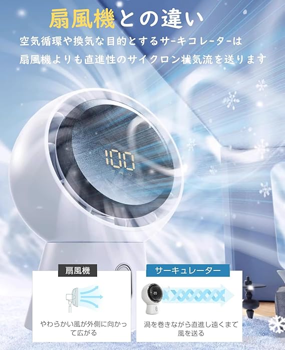 【2025年革新デザイン&高性能DCモーター搭載】 このサーキュレーターは革新デザインと高性能DCモーターを採用し、直進性の高い風を発生させ、空気を循環する性能に特化しています。室内の空気が循環させて温度差を少なくし、エアコンは温度調節できます。コンパクトながら風力は抜群で、オフィスや寝室の空気を効率的に循環させます。