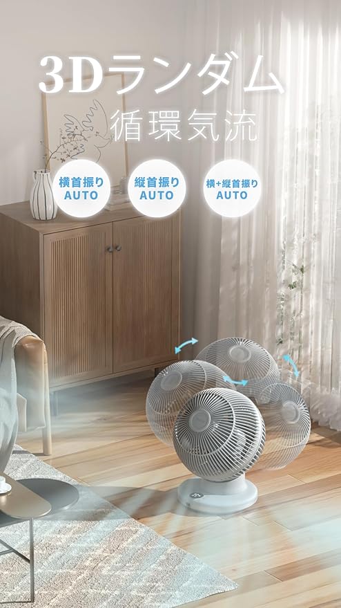 【自動首振り】上下左右同時に自動で首振りする立体首振り機能を搭載しています。左右合計85°、上向き90°までの首振りでお部屋全体に風を届けます。 除湿機、加湿器、エアコ