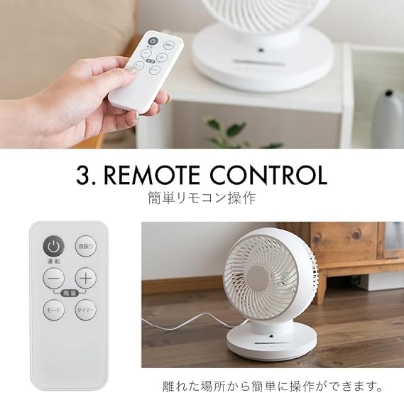 扇風機の左右だけの首振りとは違い、真上を含め、時計回り、反時計回りとグルっと回転するので、空気の循環、換気に最適です! 360度のお好きな角度で固定も可能!