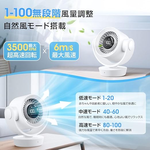 【無段階調速&広角首振り・静音DCモーター搭載】この卓上扇風機は、風量を1〜100段階で自由に調整できる無段階調速機能を備えており、自分の好みや環境に合わせてきめ細やかな風量コントロールが可能です。エアコンと併用しても快適な風を送ることができるため、夏の暑さ対策や空気循環に最適です。さらに、上下90度・左右150度の自動首振り機能を搭載し、卓上扇風機 首振り仕様で部屋全体に風を広げ、空気のこもりを防ぎます。静音性に優れた卓上扇風機 dcモーターを使用しているため、運転音が非常に静かで、仕事中や就