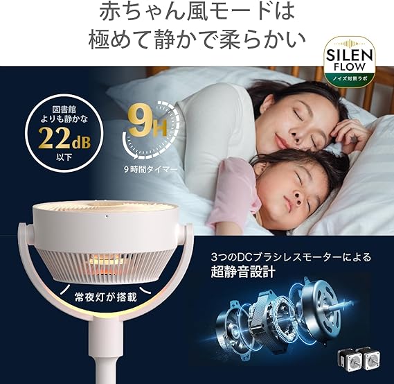 【独自の「SilentFlow」超静音技術&高性能DCモーター】 Polar Cedarは、独自開発の静音エアダクト構造とスパイラルグリル設計により、かつてない圧倒的な静音性を実現。さらに、メインモーター+上下・左右の首振り用モーターの計3つの業界最新の高品質・超静音DCブラシレスモーターを内蔵。**運転音は最小約22dB※**と図書館よりも静かで、就寝時やリモートワーク中も快適にお使いいただけます。また、28cmの大口径ファンが力強い風を送り出し、32畳の空間でも約10分で室温を約2℃下げる送