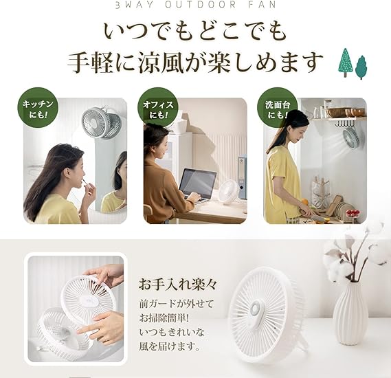 【2024年新型・1台3役 扇風機】 卓上・壁掛け・吊り下げの3Way ミニ扇風機です。コンパクトでシンプルなデザインはオフィスのデスクにもぴったり、洗面台にフックに引っ掛けるだけで壁掛け扇風機に早変わり、キッチンツールの掛け具などどこにも引っかかることが可能。さらに、テントやタープに吊り下げてシーリングファンとしてお使い頂けますので、あらゆる場所で活躍できます。
