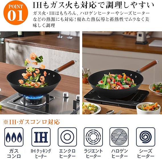 【中華鍋多機能】1鍋7役の万能性能 深さ9.5cmの実用設計で、炒め物からスープ煮込み、揚げ物まで対応。重量約1.3kgの軽量ボディで女性でも片手操作可能。木製ハンドルの耐熱グリップが滑り止め効果を発揮します。