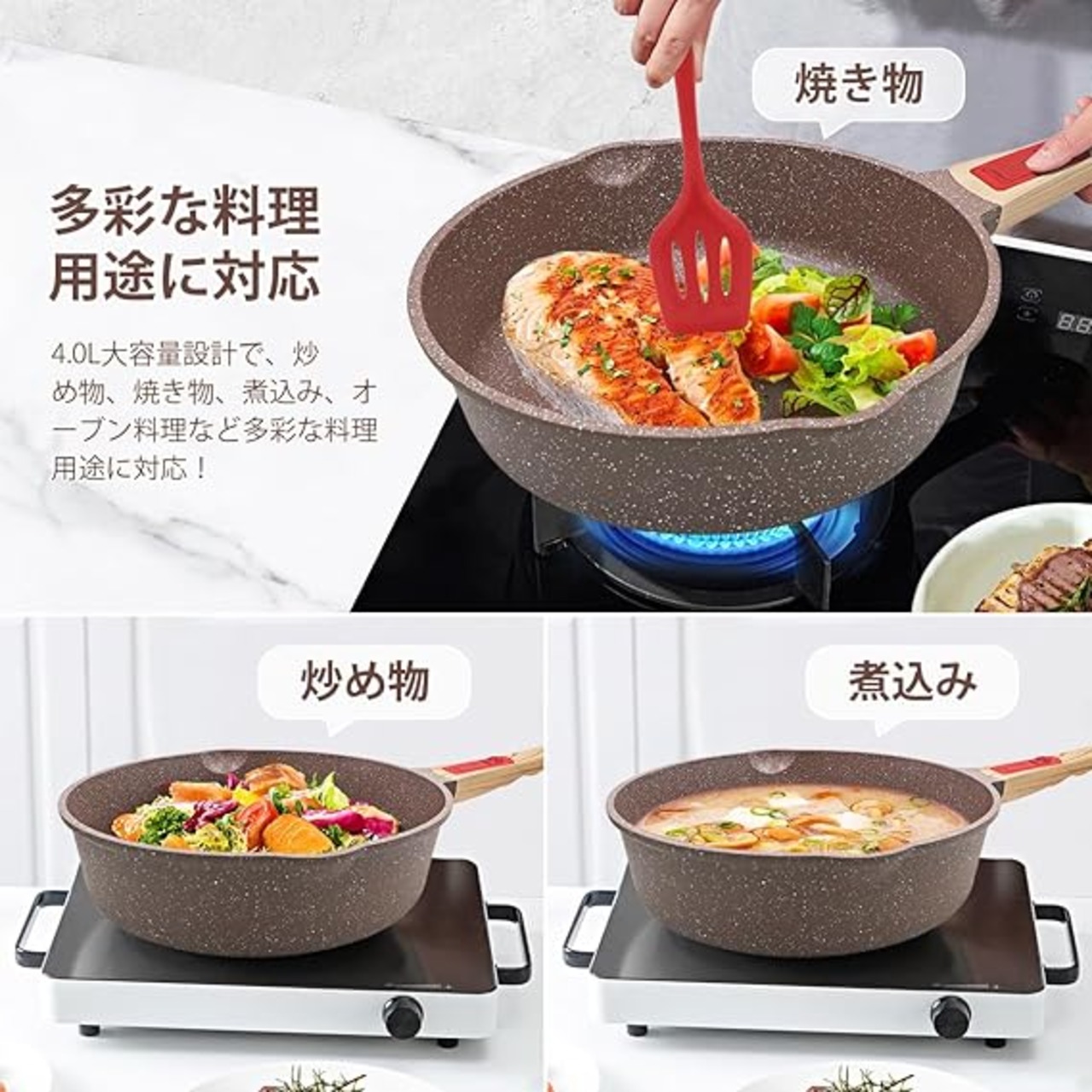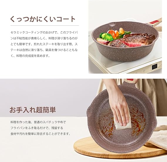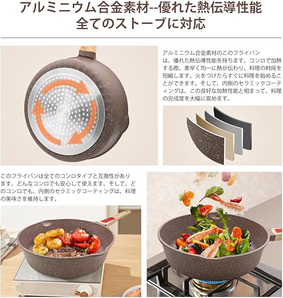 セラミックコーティング:セラミックフライパンには先進的なセラミックコーティングを採用しています。食べ物がくっつくことを防ぎ、油煙の発生を減らし、洗いやすく、調理を楽にします。また、セラミックコーティングは安全無害で、家族と安心して食べられます。