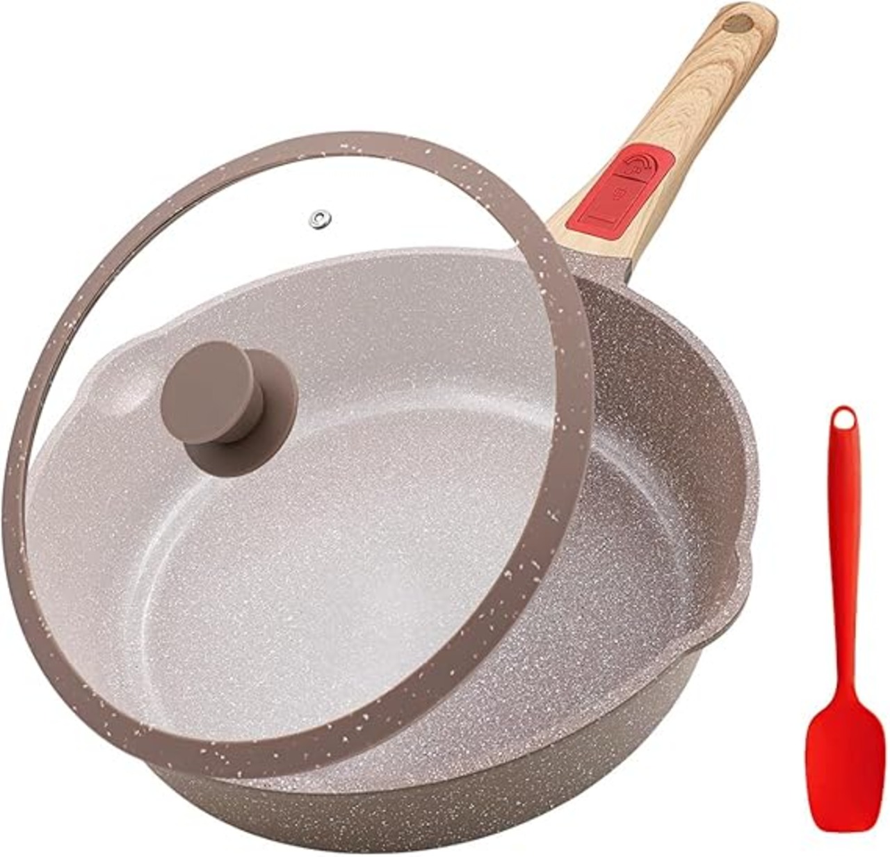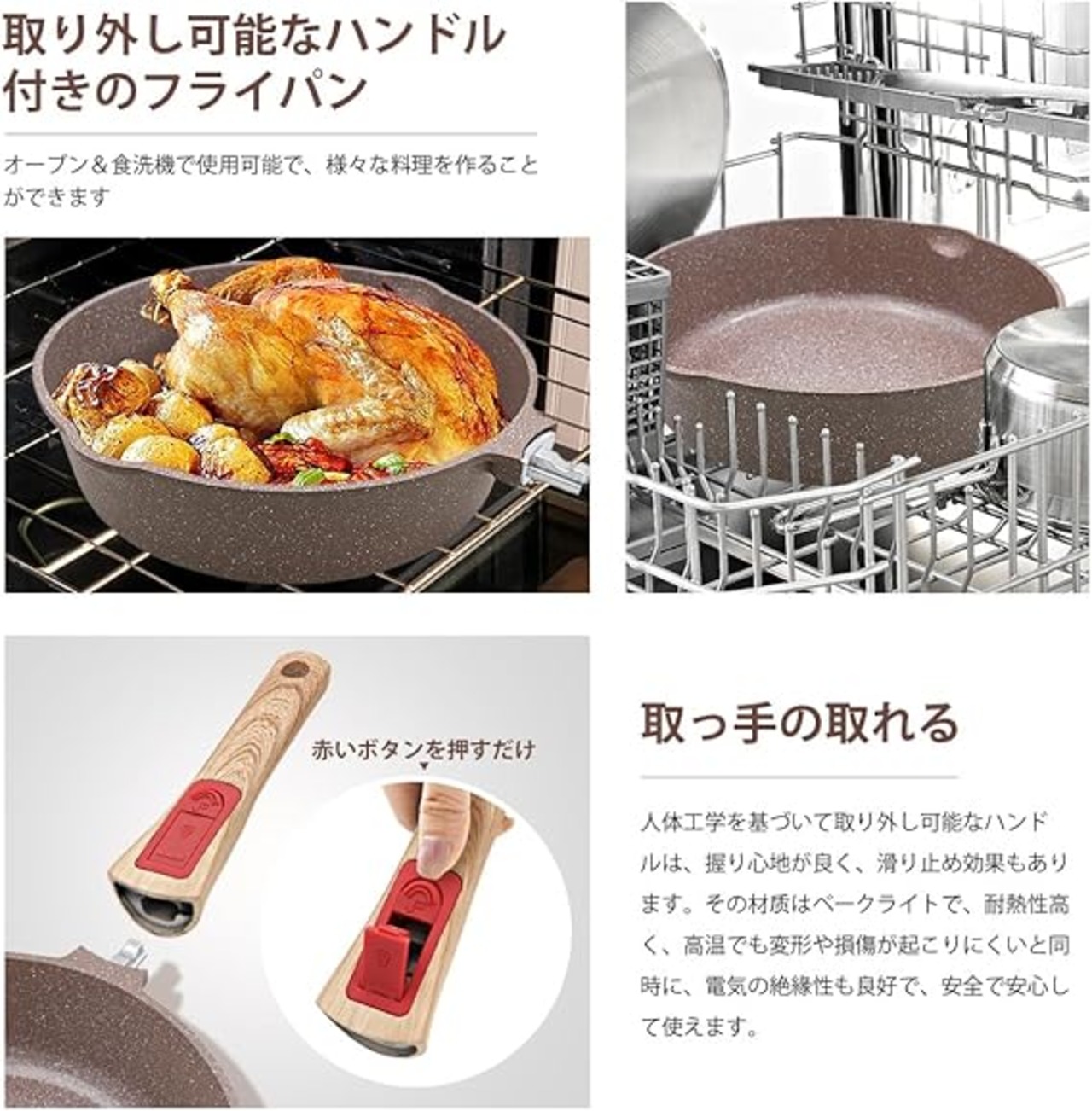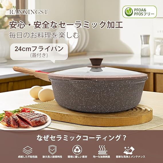 RANXINGST フライパン 24cm シリコーン蓋付き 炒め鍋 IH・ガス火対応 くっつかないセラミックコーティング&取っ手の取れる オーブン&食洗機対応 PFOA PFOS フリー ブラウン a