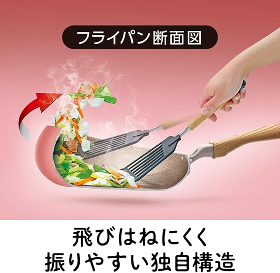 食材を振りやすい独自構造。炒飯や野菜炒めを上手に振って調理したいけど、なかなか上手くいかない。そんな方の為に、フライパンを振ることに最適な形にこだわりました。思わず、「私ってこんなに料理上手だっけ?」と感じてしまう使い心地です。