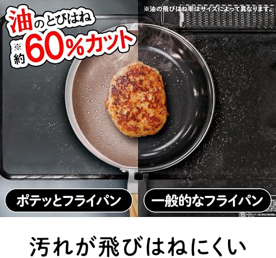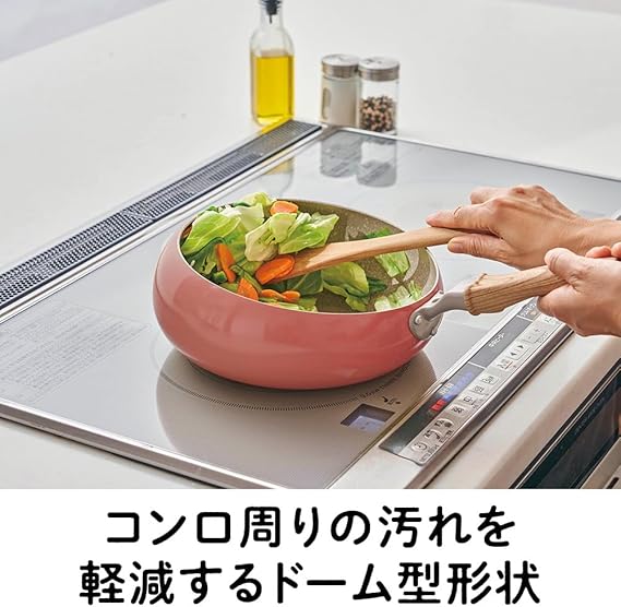汚れが飛び跳ねにくい。側面から先端にかけてドーム型形状なので、通常のフライパンで調理したときに比べて、コンロの周りに汚れが飛び跳ねにくくなっています