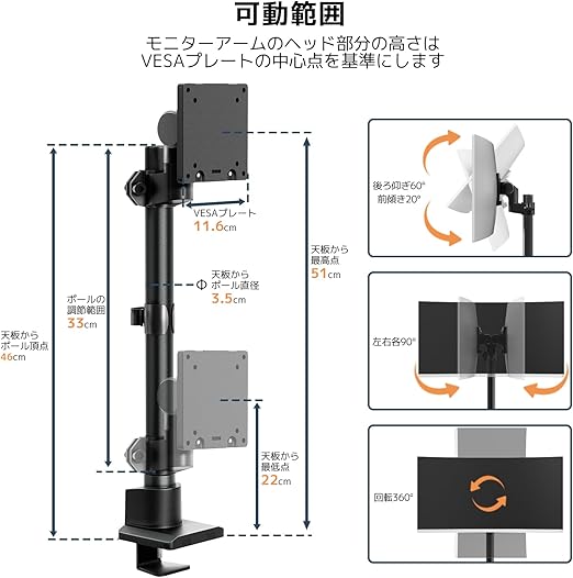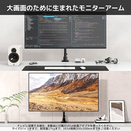 ACCURTEK 大型 モニターアーム 1画面 シングル 57インチ (2~27kg対応/湾曲モニター2~22kg対応) VESA規格対応 ロング ポール デスクマウント 高さ調整可能 スチール製 1個 1関節 ポール ブラック AC80-10P a