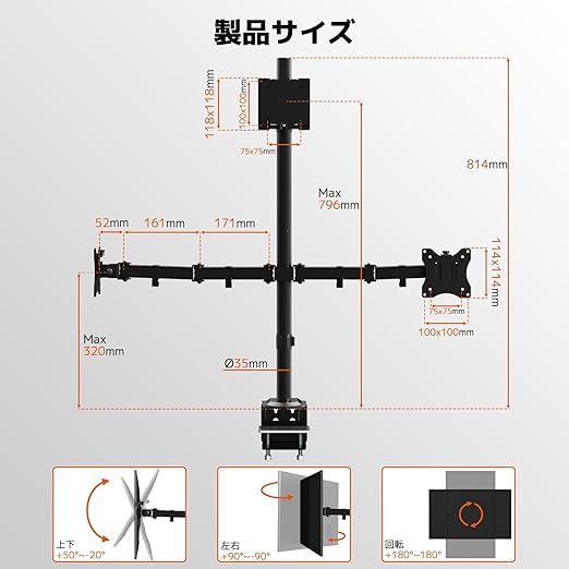 【全方位運動】モニターは(+50°〜-20°)の傾斜と、左右各90°、回転360°。アームの関節で180°の回転と360°の回転を提供し、縦方向または横方向の方向