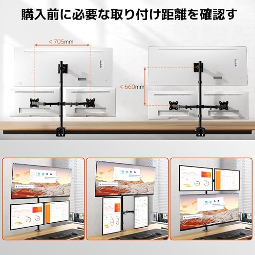 【3画面モニターアーム】3台モニターを同時に設置し、中心に最大49インチの超ワイドディスプレイを1つ、側面に最大32インチの標準ディスプレイを2つ、VESA 100x100mm/75x75mm。