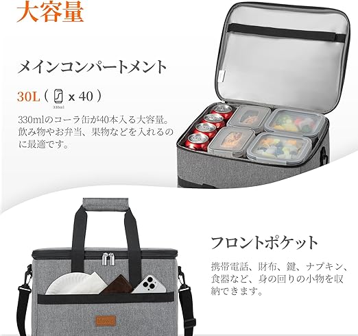 大容量: 36×29×30cmの30L容量。330mlのコーラ缶なら40個を収納可能。大きく開くメインコンパートメントは、飲み物、食べ物、サンドイッチ、スナック、フルーツ、お弁当箱などを入れるのに最適。さらに、ナプキン、携帯電話、財布、鍵などの必需品を収納できる深めのフロントポケットが付いています。あらゆるシーンで活躍する、容量たっぷり、使い勝手の良いランチバッグです!