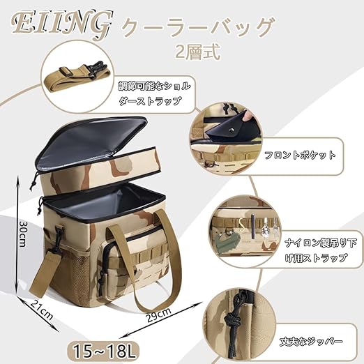 【デュアルレイヤーデザイン】: ソフトクーラーボックス、二重の分離したコンパートメントでデザインされています。温かいものと冷たいものを別々に保存できる。 容量は18リットル(上部コンパートメントが3リットル、下部コンパートメントが15リットル)前面、左右にポケットがあり、携帯電話、ティッシュ、充電器、水筒などを収納できる。フロントにはMOLLEデザインがあり、カラビナや鍵、サングラスなどをかけて収納便利です。