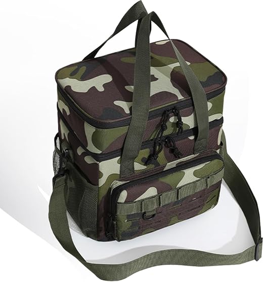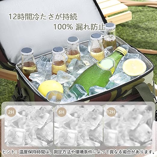 【デュアルレイヤーデザイン】: ソフトクーラーボックス、二重の分離したコンパートメントでデザインされています。温かいものと冷たいものを別々に保存できる。 容量は18リットル(上部コンパートメントが3リットル、下部コンパートメントが15リットル)前面、左右にポケットがあり、携帯電話、ティッシュ、充電器、水筒などを収納できる。フロントにはMOLLEデザインがあり、カラビナや鍵、サングラスなどをかけて収納便利です。