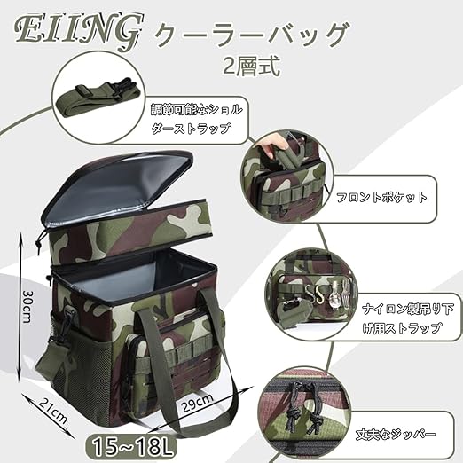 EIING クーラーボックス 二つ折り断熱ランチバッグ 上下2段 乾湿分離 保冷保温バッグお弁当袋 15〜18リットル 小型 軽量 ソフトクーラーボックス 二層式 調節可能なショルダーストラップ付き MOLLE設計 手提げと肩掛け両用 防水 漏れ防止 軽量 簡単収納 アウトドア キャンプ ピクニック通勤等に大活躍 c