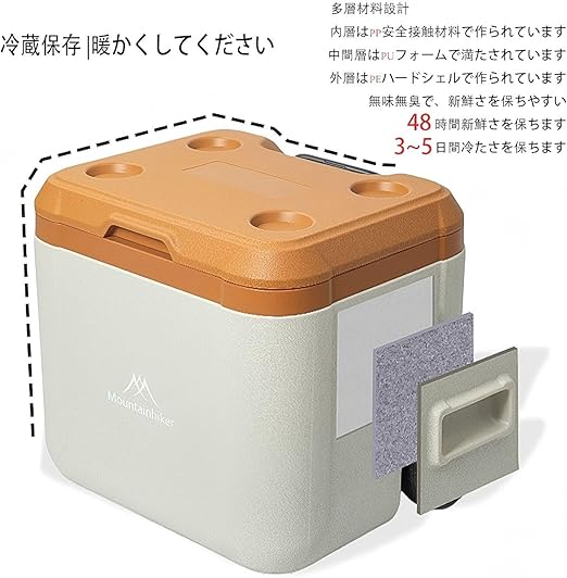 大容量設計、複数人使用に適用:30L/52Lの2サイズ展開、食材や飲み物、氷などをたっぷり収納でき、キャンプ、BBQ、釣りなど様々なアウトドアシーンで活躍。クーラーボックス容量:30L/32QT、重量:4.6KG、サイズ[外寸]:46*35*44cm、[内寸]:36x23x34cm 【材質】外層:ポリエチレン(PE)、層間充填材:保温層に高密度ポリウレタンフォームを採用(PU)、内層:PP(ポリプロピレン)