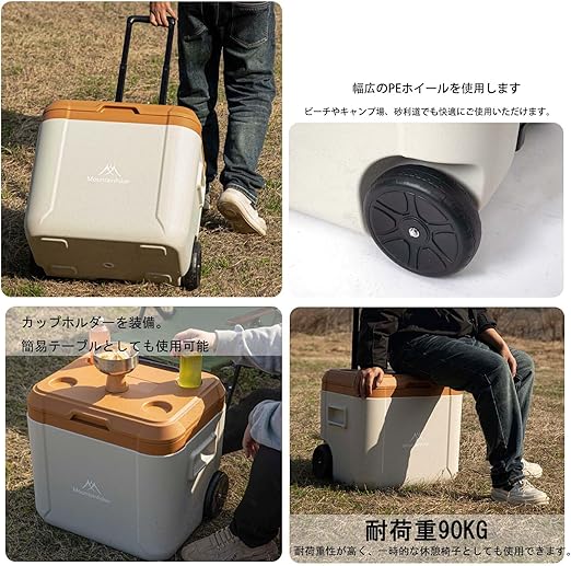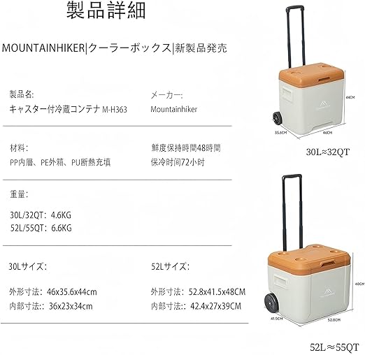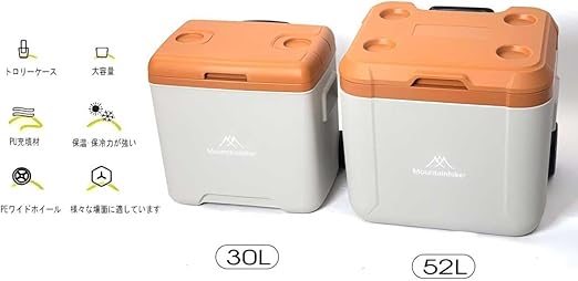 Mountainhiker クーラーボックス 30L/52L大容量 保冷・保温ボックス キャスター付き アルミ合金ハンドル付き ポータブル冷蔵庫 5日間長時間保冷 キャンプ/BBQ/釣り/アウトドア/スポーツ観戦に最適 a