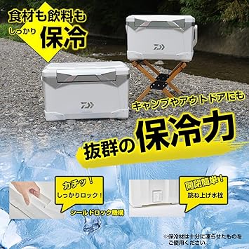 更に剛性がアップした座れる頑丈「マッスルボディ」 開閉便利なワンハンドオープン、取り外し可能でお手入れ簡単な両開き上フタ 新機構の「シールドロック機構」は押し込むだけで密閉性がアップするので安心 90度まわすだけで開閉簡単、手が汚れにくい跳ね上げ水栓付き クーラー内の水を素早く排